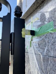 門扉を支える支柱は、設置位置を正確に保つため、木材を用いて仮固定を行います。この工程により、施工中のずれや傾きを防ぎます。