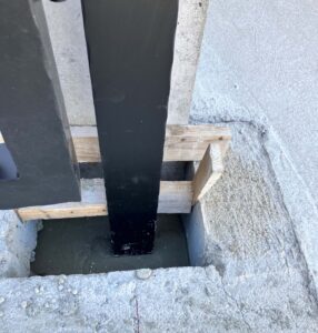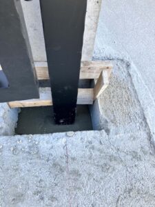 支柱に基礎部分にはモルタルを充填し、しっかりと固定します。
